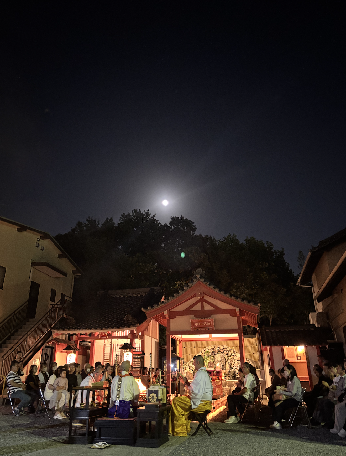外での護摩は、月の光のもと、風も吹き抜け、自然を感じながらの護摩修行となり、普段お堂の中でしか護摩を焚きませんので、とても新鮮でいつもとは違う五感に触れながらのお勤めとなりました。